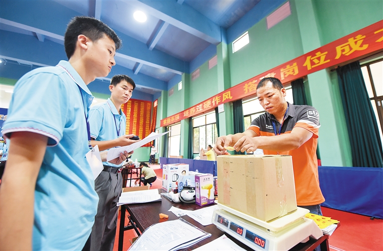 大赛现场气氛紧张,选手们精神饱满、气势昂扬,以娴熟的技艺和过硬的水平,展示了各企业精神风貌和员工职业素养。据了解,本次竞赛分为理论知识与实操技能两个部分,实操技能主要包含多物品收寄、易碎品包装、派送线路设计、快件装车、国内快件分拣、建立总包等项目(见上图)。
