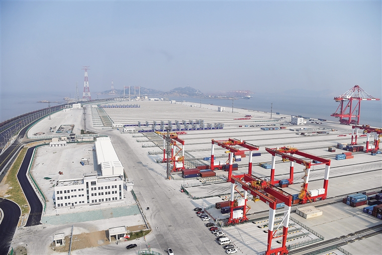 7月25日拍摄的上海洋山深水港四期工程码头(局部)。 正在建设中的全球最大集装箱全自动化码头——上海洋山深水港四期工程目前已进入最后的设备安装和调试阶段,计划年底开港试运营。 洋山深水港四期工程项目总用地面积达到2.23平方公里,前期的基建工程由中建港务、中交上海航道局、中交三航局联手完成。洋山四期拥有2350米的岸线,一次性建成7个泊位。今年年底开港后,将形成400万标箱/年的吞吐能力。后期继续扩大规模,吞吐量将达到630万标箱/年。 新华社记者 申宏 摄