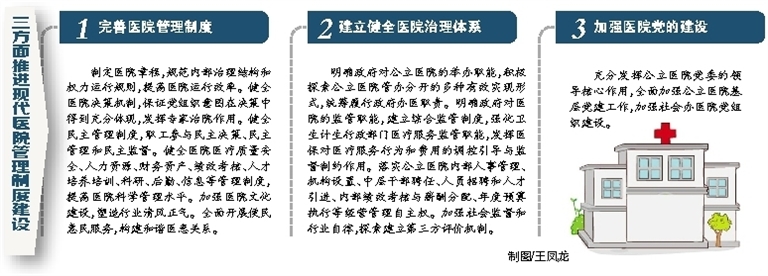 制定医院章程,规范内部治理结构和权力运行规则,提高医院运行效率。健全医院决策机制,保证党组织意图在决策中得到充分体现,发挥专家治院作用。健全民主管理制度,职工参与民主决策、民主管理和民主监督。健全医院医疗质量安全、人力资源、财务资产、绩效考核、人才培养培训、科研、后勤、信息等管理制度,提高医院科学管理水平。加强医院文化建设,塑造行业清风正气。全面开展便民惠民服务,构建和谐医患关系。