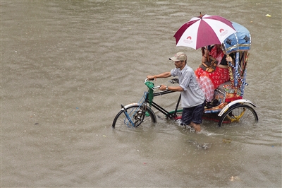 7月25日,在印度安拉阿巴德,人力车夫拉着乘客在积水的街道上前行。 受雨季强降雨影响,印度东北部的阿萨姆邦、奥里萨邦和西孟加拉邦以及西部的古吉拉特邦等地近日遭受严重水灾,水灾给当地居民生活造成严重影响。 新华社/美联