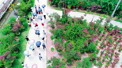 近日,万宁市万城镇联星村委会溪边村三角梅基地,花开正艳,吸引不少游客前来观光。