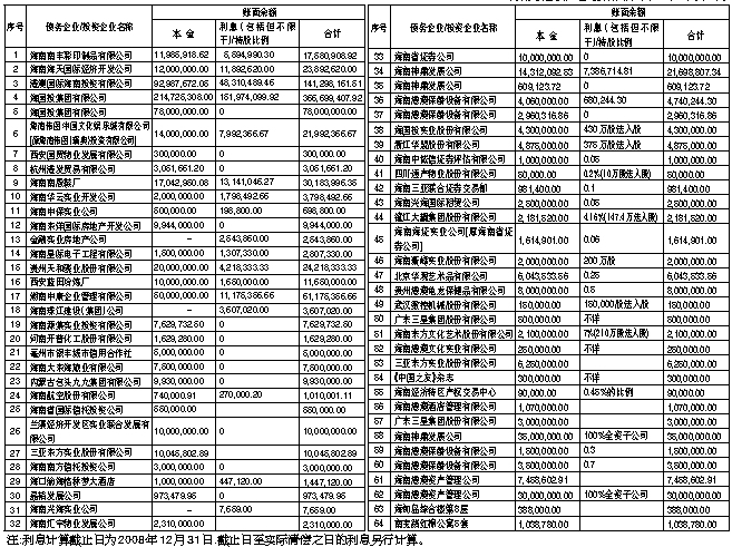 根据协议,海南联合资产管理有限公司(原海南联合资产管理公司,下同)已从相关金融机构受让了下列债权、股权投资权益、其他类资产及其相关权益(清单所列利息计算基准日为2008年12月31日。基准日至实际偿还之日止的应付利息按相关约定届时另行计算)。海南联合资产管理有限公司作为下列债权、股权投资权益、其他类资产及其相关权益的受让人,现公告要求债务人、担保人及其他义务人立即向海南联合资产管理有限公司履行相应合同约定或法院判决所确定的义务(若债务人、担保人及其他义务人因各种原因更名、改制、歇业、吊销营业执照或者丧失民事主体资格,请相关承债主体、清算主体代为履行义务或者承担清算责任)。联系电话:0898-68582219;联系地址:海南省海口市滨海大道81号南洋大厦23楼。