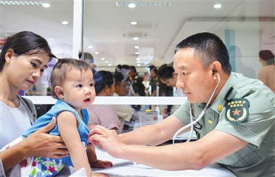 7月27日,在老挝首都万象,中国人民解放军赴老挝“和平列车”医疗队队员(右)为老挝民众义诊。 中国-老挝“和平列车-2017”医疗服务活动27日开幕,中国人民解放军赴老挝“和平列车”医疗队开始为当地军民提供义诊,医疗服务、学术交流等工作全面展开。 新华社发