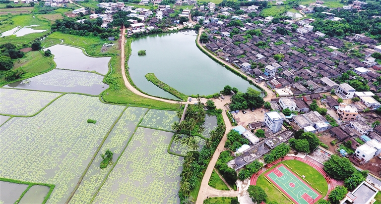 航拍澄迈金江镇美丽乡村大美村。大美村自然风光美丽,人文历史悠久,全村保存有火山岩垒砌的一间三格古石屋200多间,是我省至今保存较为完整的规模较大的明清古民居建筑群。本报记者 程范淦 通讯员 王家专 摄