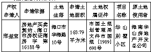 根据海南省人大常委会《关于加快积压房地产产权确认工作的决定》,现拟对下述积压房地产土地确权登记申请的审核情况予以通告(详见下表)。如对通告的土地使用权、所有权及他项权利有异议者,请在通告之日起60日内,以书面形式并持有关证据到海口市国土资源局龙华分局(国贸二横路国土大厦14楼)办理异议登记或复查手续。逾期没有提出异议的,即认为通告的权益无异议。