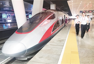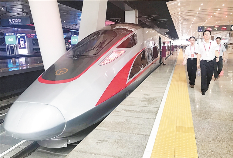 7月27日,“复兴号”停靠在北京南站。 当日,中国铁路总公司安排“复兴号”在京沪高铁开展时速350公里体验运营。来自国家有关部委、企业代表及部分院士、专家等共计300余人参加体验。体验过程中,铁路部门向参加体验的人员介绍了“复兴号”动车组有关情况,并进一步征求了对“复兴号”动车组及我国高铁发展方面的意见建议。 新华社记者 樊曦 摄