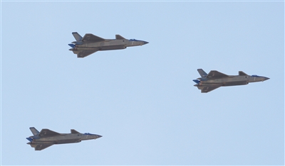 3架歼-20战机组成楔队咆哮而过。这款由我国自主研发的第四代超音速隐身战斗机,于去年在珠海航展上惊鸿一瞥之后,首次以战斗姿态展示在世人面前。