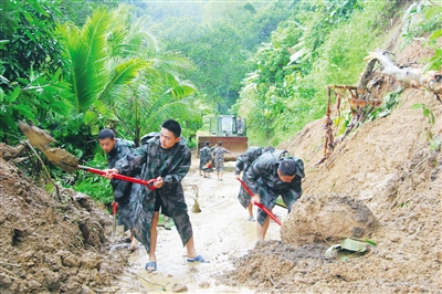 “部队驻地群众有了困难,人民子弟兵就应该顶上去。”该部队相关负责人说,他们一边让值班室向上级请示报告,一边组织官兵奔赴现场展开救援。什会村村口两棵桶口粗大树、十几根电线杆被风吹倒,上百立方米的泥土以及横七竖八的树枝把进村道路全部堵死,一些村民被堵在外面进不了村,有的带着小孩,被雨淋已有数个小时,瑟瑟发抖。一处滑坡的泥土已危及到山坡上一户黎族群众的民宅,如再塌方就会掩埋房屋,面对大面积的塌方,群众焦急万分。