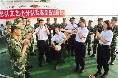 7月31日,文艺小分队队员为秦皇岛边防支队官兵表演文艺节目。 当日,河北省公安边防总队组织文艺小分队深入到驻秦皇岛、唐山、沧州等地的基层边防部队,为执勤一线官兵表演文艺节目,送上八一建军节的问候。 新华社记者 杨世尧 摄