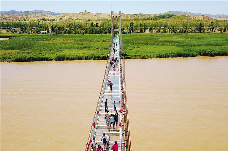 8月2日,黄河3D玻璃桥横跨黄河两岸,吸引了不少游客前来体验。 近日,国内首座横跨黄河两岸的3D玻璃桥在宁夏中卫市沙坡头景区亮相,正式对游客开放。 据了解,黄河3D玻璃桥是在沙坡头悬索桥的基础上,将原有木板替换为钢化玻璃改造而成,玻璃桥面长210米,宽度为2.6米,桥面距河面的垂直高度为10米。 新华社记者 李然 摄