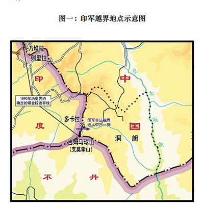 2.2017年6月16日,中方在洞朗地区进行道路施工。6月18日,印度边防部队270余人携带武器,连同2台推土机,在多卡拉山口越过锡金段边界线100多米,进入中国境内阻挠中方的修路活动,引发局势紧张。印度边防部队越界人数最多时达到400余人,连同2台推土机和3顶帐篷,越界纵深达到180多米。截至7月底,印度边防部队仍有40多人和1台推土机在中国领土上非法滞留。