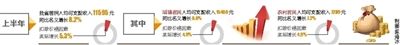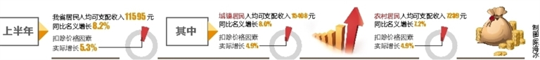 上半年,我省居民人均可支配收入11595元,同比名义增长8.2%,扣除价格因素,实际增长5.3%。其中,城镇居民人均可支配收入为15408元,同比名义增长8.0%,扣除价格因素,实际增长4.9%。四大项收入呈“三稳一快”态势,结构不断优化:人均工资性收入、家庭经营净收入、财产净收入、转移净收入分别为10315元、1557元、1222元、2314元,同比分别增长7.1%、9.2%、12%、9.3%。