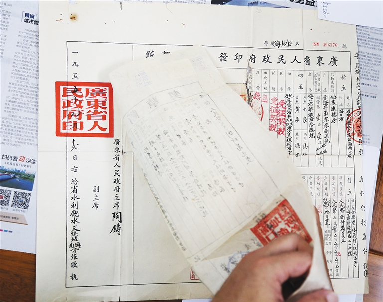 “当时海南还没有建省,属于广东省,所以契纸是广东省人民政府印发的。”宋静敏指着泛黄且带有折痕的契纸介绍说。契纸上,写着“一九五三年十月拾壹日右给合德堂林义轩等”,红色方形的广东省人民政府印中正地盖在竖体字日期上,落款是时任广东省政府主席叶剑英。