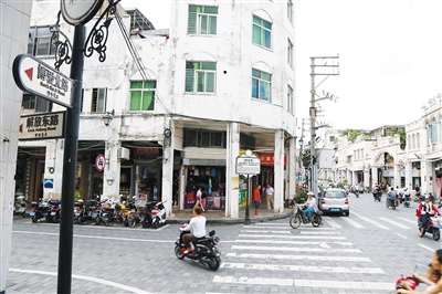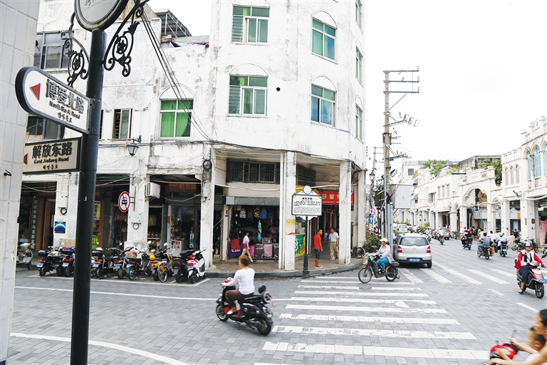 没被注意到也情有可原。因为民国时期老海口解放路东一段的原名并非如此,而是被叫作“永乐街”,它和博爱路不连通,两条路一横一纵型同“丁”字,路上的商铺百姓各做营生,从这一条路走到另一条路,要拐一个大弯。