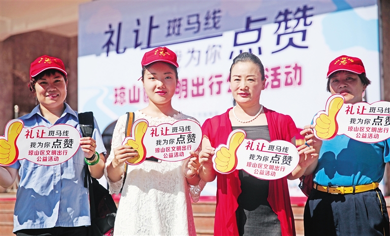 8月6日上午, 出租车司机代表和私家车司机代表展示“礼让斑马线 我为你点赞”车贴。当天,为了提高全社会的交通法制意识、安全意识、文明意识,由海口市琼山区主办的“礼让斑马线,我为你点赞”主题活动在海口启动。