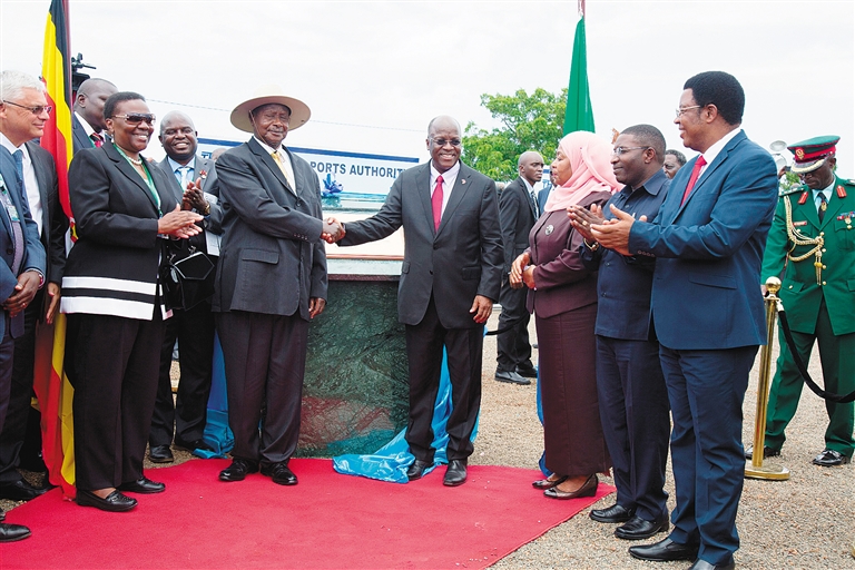 8月5日,在坦桑尼亚坦噶地区,坦桑尼亚总统马古富力(中右)和乌干达总统穆塞韦尼(中左)参加奠基仪式。 世界最长电加热石油管道5日在坦桑尼亚坦噶地区奠基。据悉,该石油管道全长约1400公里,预计造价35.5亿美元,将成为世界上最长的电加热石油管道。 新华社发