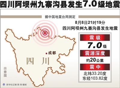 8月8日21时19分,四川省阿坝州九寨沟县发生7.0级地震,震源深度为20公里。震中距离九寨沟县城35公里,距阿坝州210公里,距成都市290公里,距甘肃陇南市100公里。四川、甘肃、青海、宁夏、陕西多省区震感明显,局部地区震感强烈。