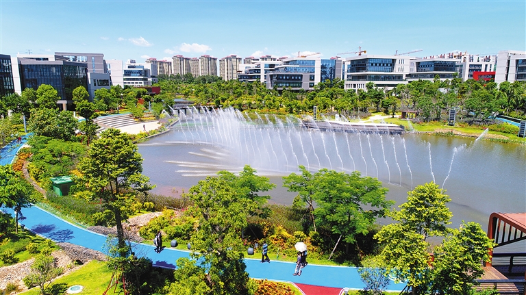 一湾碧水旁鲜花簇簇、草木丰茂,湖中央的喷泉随着音乐起舞;环湖跑道上,来自各企业的员工或漫步,或驾驶平衡车前行,或轻松地交谈……这一幕幕令人心旷神怡的场景,是今天早上记者在位于海南老城经济开发区的海南生态软件园沃克公园中见到的。