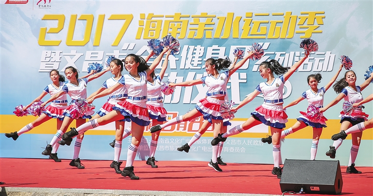 8月8日是全民健身日,我省各地举办丰富多彩的全民健身运动表演。图为文昌市举办的健美操比赛。
