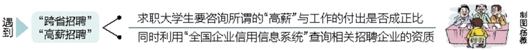 武志东介绍,在这种传销骗局中,“跨省招聘”往往是传销组织常用的伎俩,利用外地求职者不了解当地情况,在网上发布虚假招聘信息提供所谓“好职位”和高薪引诱毕业生“上钩”。如果求职者遇到“跨省招聘”、“高薪招聘”等字眼,就应该提高警惕,要咨询亲友所谓的“高薪”与工作的付出是否成正比,同时利用互联网上的“全国企业信用信息系统”,查询相关招聘企业的资质,并最好由当地亲友提前了解招聘企业的情况。