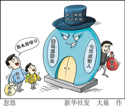 事实上,早在2012年,新华社就曾播发报道揭露类似骗术,但几年后,相似的骗术依旧换汤不换药地重现。吴遵民说,这些骗术之所以屡屡得逞,归根结底是急功近利之心蒙住了家长的双眼。此外,教育行政、市场监管部门应对办学机构的资质严加审核,并加大对无证办学的打击力度。(据新华社上海电)