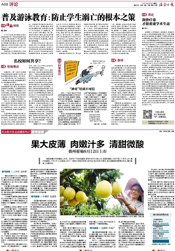 高成本种出来的蜜柚也更有特色。果大皮薄、肉嫩汁多、清甜微酸的儋州蜜柚在全国独树一帜。“蜜柚的糖度一般在10左右,而大成水晶蜜柚,糖度一般在13左右,最高的可以达到15。”侍文博说,汁水多不多,也是蜜柚品质高低的重要指标,大成水晶蜜柚,两瓣就可以榨出半碗水。