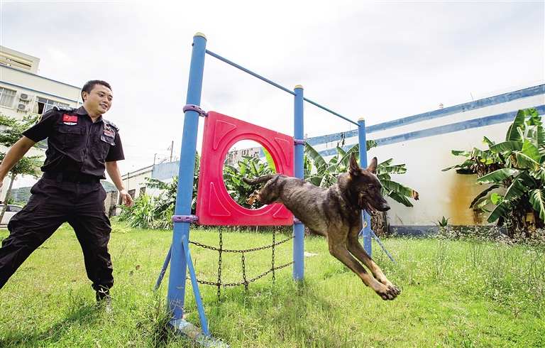 上午八九点的阳光,将犬队训练场上的草地晒热了。青草香气在蒸腾中弥漫,钻洞、独木桥、障碍板、人字板、三级楼梯障碍等各种模拟设备,静静立在场上,等着与警犬的再次相逢。