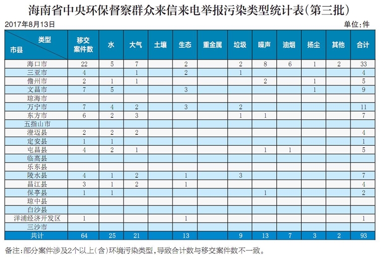 海南省中央环保督察群众来信来电举报污染类型统计表(第三批)