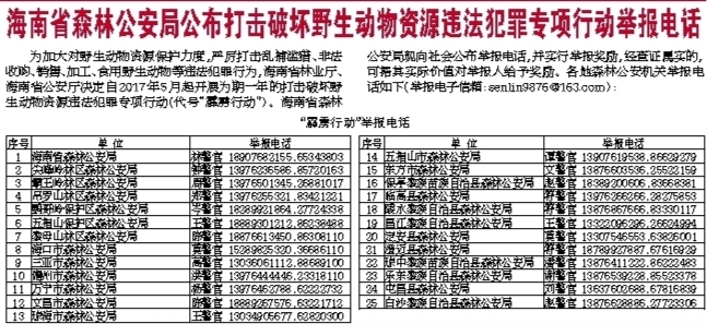 海南省森林公安局公布打击破坏野生动物资源违法犯罪专项行动举报电话
