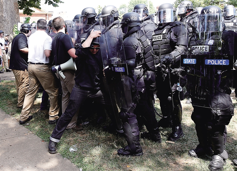 8月12日,在美国弗吉尼亚州夏洛茨维尔,集会者与警方发生冲突。 美国弗吉尼亚州夏洛茨维尔12日大规模集会期间发生暴力事件,导致至少1人死亡、34人受伤。美国总统特朗普当天对暴力表示谴责。他在出席一个活动时说:“多方都表现出令人震惊的仇恨、偏见和暴力,我们以最强烈的言辞谴责这些行为。” 新华社/路透