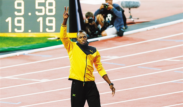 北京时间8月14日凌晨,2017年国际田联世界田径锦标赛在英国伦敦落幕。在本届世锦赛结束后就退役的牙买加短跑运动员博尔特来到伦敦奥林匹克体育场,与跑道和观众挥别。图为博尔特在显示着由他创造的男子100米和男子200米世界纪录的计时器前向观众致意。 新华社发