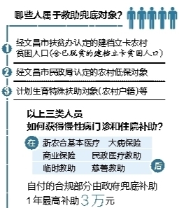 根据文昌近期下发的《文昌市农村贫困人口大病医疗兜底救助实施方案》要求,兜底对象在文昌市内定点医疗机构即时结报。专项医疗救助保障对象在文昌市内各级定点医疗机构慢性病门诊或住院治疗,需向定点医疗机构提交医疗证(或健康卡)、身份证(或户口簿)、扶贫手册等。