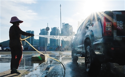 8月17日下午,三亚鹿回头广场公园改造项目工地,工作人员给外出车辆清洁,以免带泥上路污染环境。三亚全市正处“全民动员、全市巩卫”的阶段,全市正全力以赴、抓实抓细“巩卫”工作。