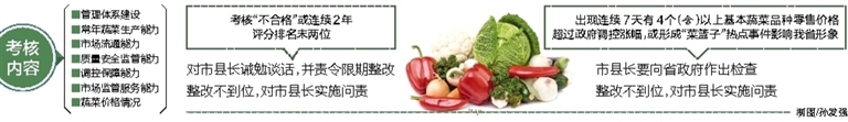 在过去一年中,出现连续7天有4个(含)以上基本蔬菜品种零售价格超过政府调控涨幅的,或形成“菜篮子”热点事件影响我省形象的,市县长要向省政府作出检查。整改不到位的,由省稳价办提出问责意见报省政府,由省政府对市县长实施问责。