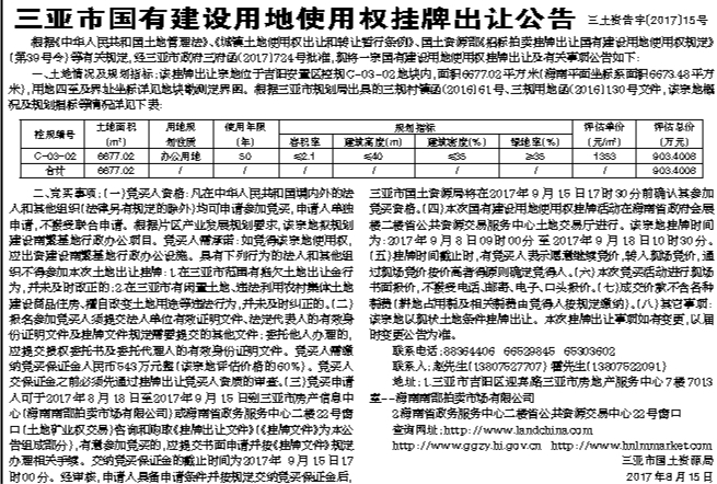 三亚市国有建设用地使用权挂牌出让公告
