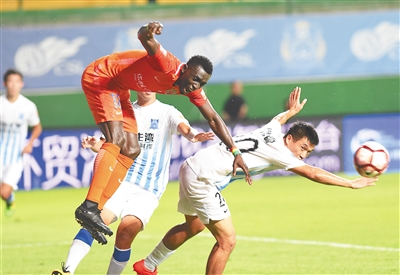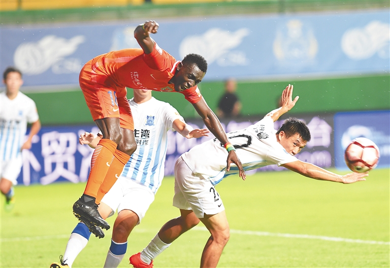 8月20日,在中超第23轮比赛中,广州富力队主场1:1战平山东鲁能队。图为鲁能队球员西塞(左)在比赛中与对手拼抢。新华社发