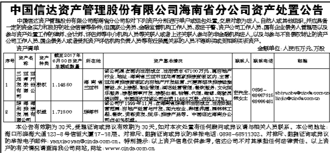 中国信达资产管理股份有限公司海南省分公司资产处置公告