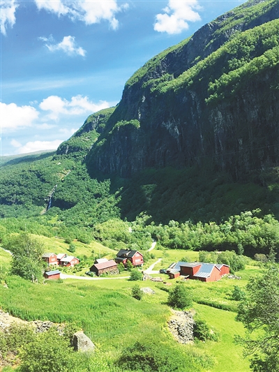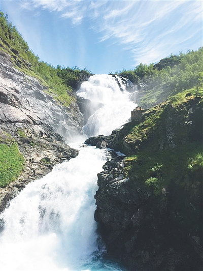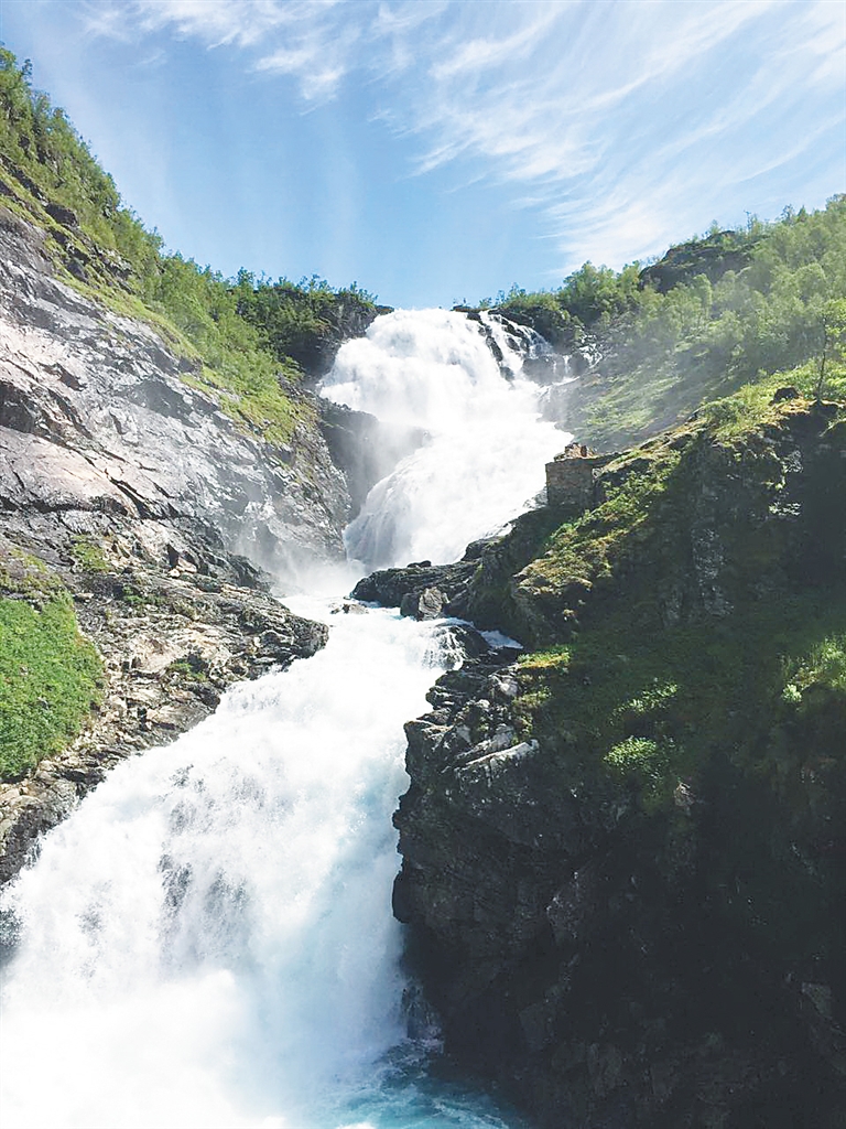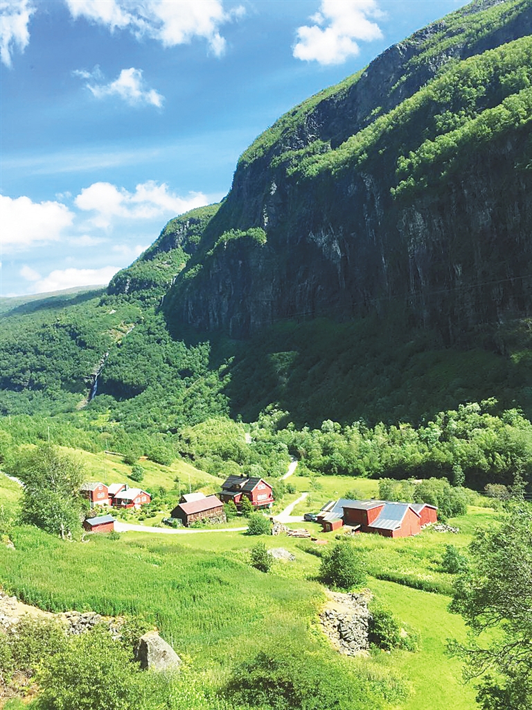 从奥斯陆到松恩峡湾所在的古德旺恩小镇300多公里,车行穿过无数条公路隧道,其中一条名叫莱达尔的山体隧道,全长24.51公里,是目前世界最长的隧道。沿途满目皆景,美不胜收,午后一点多到达古德旺恩小镇。稍作歇息,便乘坐传统木质结构的绿皮小火车游览。来回2个小时的行程,火车就像过山车一样,从海拔800多米的山区,陡降至海拔仅3米的峡湾,穿梭悬崖峡谷之间,扣人心弦。巨大的窗户外,景色每一秒都在变幻,从青翠田野逐渐变成雪白山脉,突然又有瀑布从白雪覆盖的山头飞泻而下,汹涌澎湃。目睹此情此景,车内游客惊叹不已,纷纷拿起手机相机抢拍美丽的瞬间。火车往返时两次途中停车,让游客在峡湾中最大的瀑布下拍照留念。在这一段旅行里,我们不仅欣赏到了地球上最原始的自然风貌,领略挪威峡湾的壮丽、山地的雄伟,还能偶尔看到一些古朴的民居木屋点缀于山腰间,野性中蕴藏着勃勃生机。
