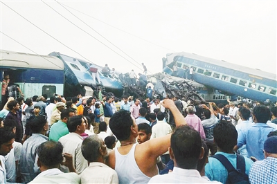 8月19日,在印度北方邦的克道利附近,人们聚集在列车出轨事故现场。 据印度媒体20日报道,印度北方邦19日发生的列车脱轨事故死亡人数已升至23人,另有70多人受伤。 新华社/美联