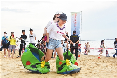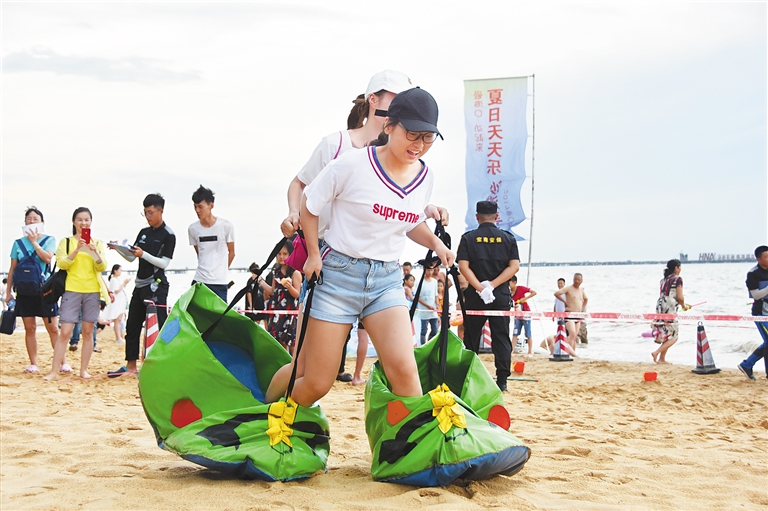 沙滩寻宝活动分为抢运海水、弄海娇子、大脚巨人和群龙戏珠4个环节开展,参与者分别完成4个闯关项目后,即可前往寻宝区随机抽取一张寻宝坐标信息,并在规定区域内找到坐标,挖掘藏宝图,最终凭藏宝图上的相关信息,到颁奖区领取相对应的奖品。
