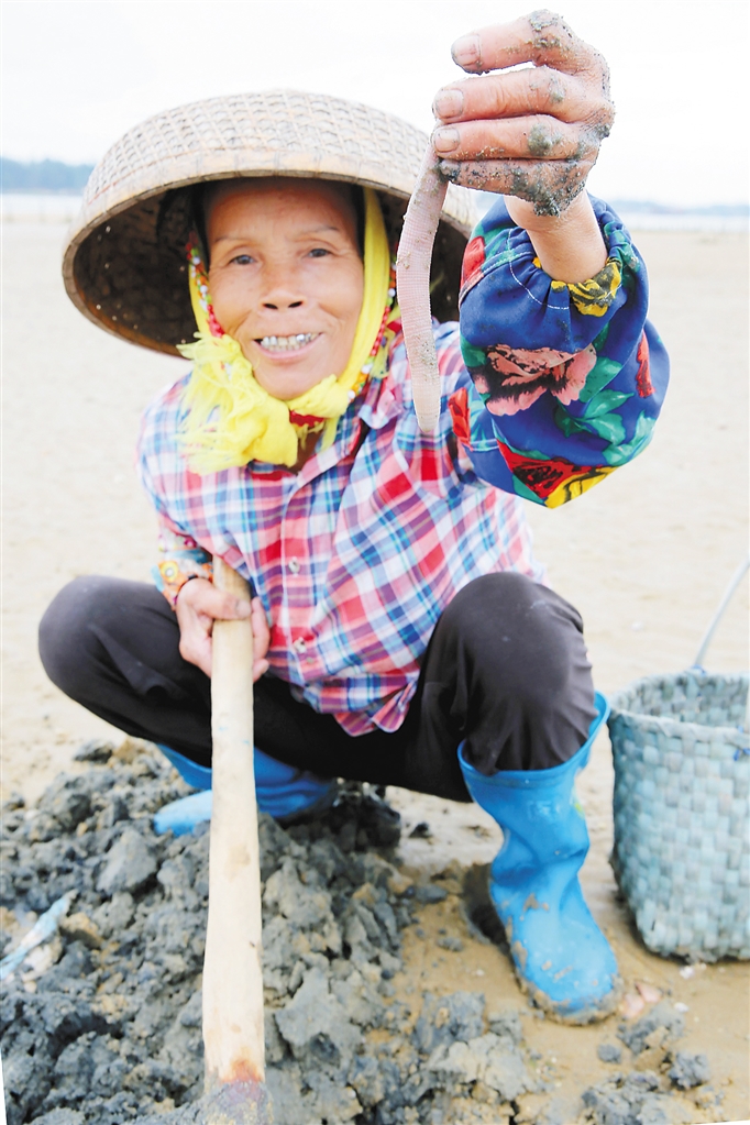 “挖沙虫是一项专业技能,普通人很难挖到。”简加保笑着说,挖沙虫不像抓鱼拾贝这么容易,沙虫藏在沙里,并且移动速度快,好不容易发现它,一不留神它又会逃得无影无踪。靠海的渔家女都是这方面的能手,挖得又快又准。到底有没有诀窍呢?简加保介绍道,沙虫钻进沙里时,会有一条沙道,但肉眼很难看到,用锄头敲沙滩表面,沙里的沙虫受惊动就会往下钻,沙道内就会溅出水来。根据水柱的情况判断沙里是沙虫还是螺,就可以在沙虫逃走的路径前挖断,抓住沙虫。