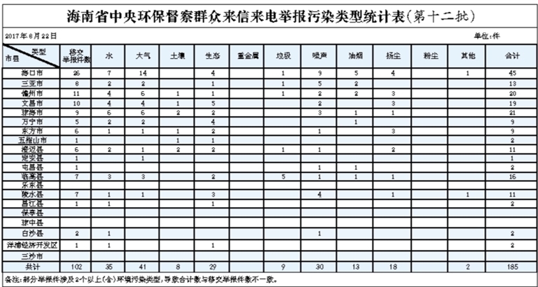 海南省中央环保督察群众来信来电举报污染类型统计表(第十二批)