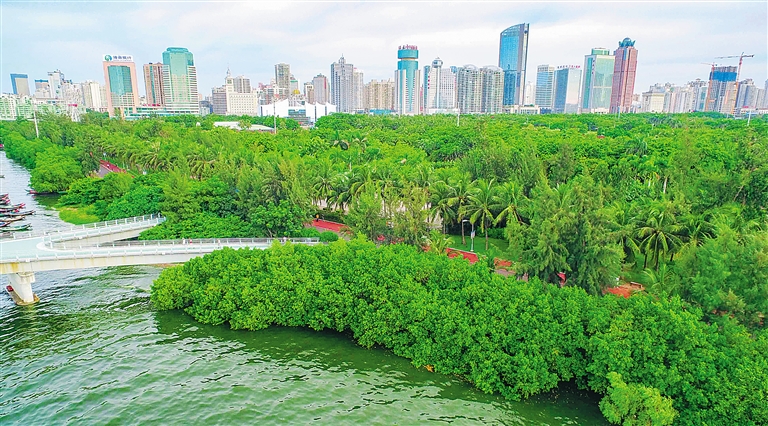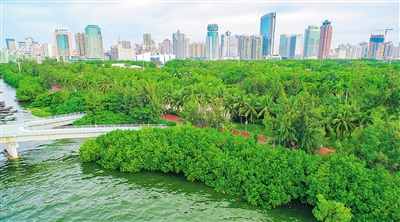 8月22日,在海口市万绿园旁龙珠湾,人工种植的红树林枝叶茂盛,郁郁葱葱,改善了这一带的海岸景观。据介绍,随着该海域生态修复的推进,水系生态系统得到恢复,丰富了海岸线的生物品种。