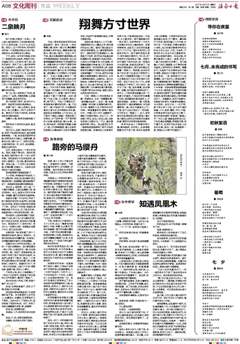 那条开满马缨丹的小路的尽头我没有走完,于是便终日幻想着那是世界的尽头,仿佛只要顺着小路拼命奔跑,尽力一跃,就能跃进另一个新奇的世界。我曾经央求母亲带我走到小路的尽头,也曾鼓吹小伙伴们一起钻进小路尽头那片茂密的林子,可依旧不能成行。每次我孤独地坐在路旁的马缨丹下,听着林子里的飞鸟扑腾着翅膀的声音,心总会跳得飞快,似乎很快就会有一两只凤凰从别的世界飞过来。