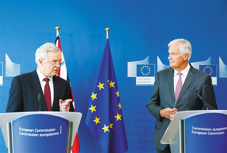 8月28日,在比利时首都布鲁塞尔,欧盟英国“脱欧”首席谈判代表巴尼耶(右)与英国“脱欧”事务大臣戴维斯在谈判开始前会见媒体。 欧盟与英国第三轮“脱欧”谈判28日下午在布鲁塞尔欧盟总部开启,双方将围绕“分手费”、欧盟公民权利以及北爱尔兰边界安排继续讨价还价。 新华社记者 叶平凡 摄