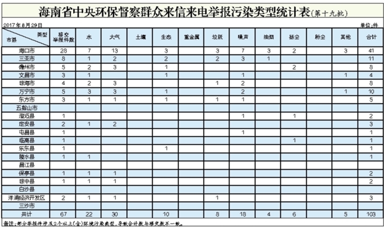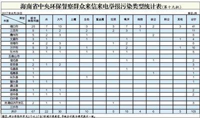 海南省中央环保督察群众来信来电举报污染类型统计表(第十九批)