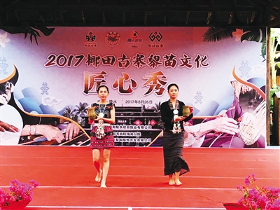 在本届匠心秀上,将黎族苗族传统民俗技艺与时尚元素融合是最大亮点,匠心秀通过走秀的形式向游客们展现了传统民族服饰、藤竹编织品、黎陶、银器等特色民俗技艺。身穿传统民族服饰的黎族阿哥、阿妹还带来了鼻箫演奏、织锦舞、竹竿舞等特色歌舞表演。黎族文脸阿婆还成为了“网红”。