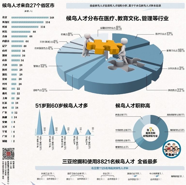 候鸟人才作为海南独特的人才现象,目前在全省行业分布、所做贡献等情况如何?2017年初,海南省人力资源开发局开展全省候鸟人才首轮征集和调查活动,在前期调研和后期大规模征集活动的基础上,对征集到的千余名候鸟人才数据进行整理和分析。样本分析结果显示,海南候鸟人才主要来自于全国27个省、市、自治区,来源广泛,其中又以北京、黑龙江、河南、河北等地居多。