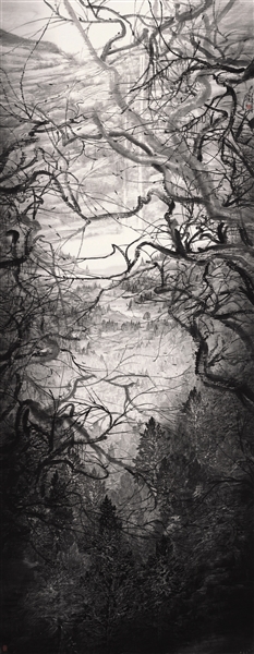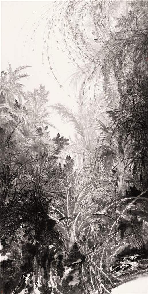 “在他的作品中,最具有新意和个性的是他的山水结构,通过密集的笔线,将山石、草木、路径、流瀑和云气混合交织为充满动感的结构,注重不同物象之间的碰撞、穿插和揉汇,创造出蓬勃葱郁的整体……”范迪安曾在《自为的化境》中这样写道。