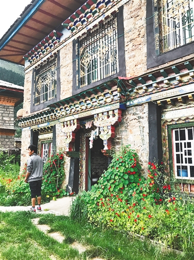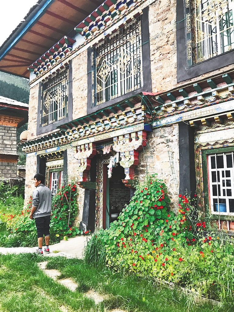 湖深处的结巴村是一处安静的村落,游玩巴松措的很多旅游团都不会在此停留,反而成就了这里的宁静悠然。迎接我们的民宿老板次仁罗布是藏族小伙,热情而又腼腆。院落里繁花盛开,两层小楼具有浓郁的藏族特色。走进客厅,宽大的茶几、繁复的装饰、精美的壁画引发小伙伴们的一阵欢呼:这就是我们想要住的藏家民宿!客厅里的炉灶火势正旺,次仁罗布已经用木材生好火。我们一阵忙碌,将途经工布江达县时购买的食材变为几盘家常菜,别有趣味。
